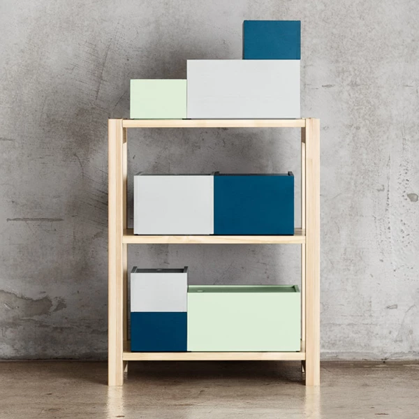 The wooden System boxes, designed by Joanna Laajisto for Lundia, are perfect for storing small objects and magazines. They fit perfectly into Lundia’s Classic shelving system and can also be used as stand-alone elements such as side tables. The System boxes are handmade form pinewood and painted in cool shades of mint, blue and grey, allowing the beautiful wood grain to show through.
