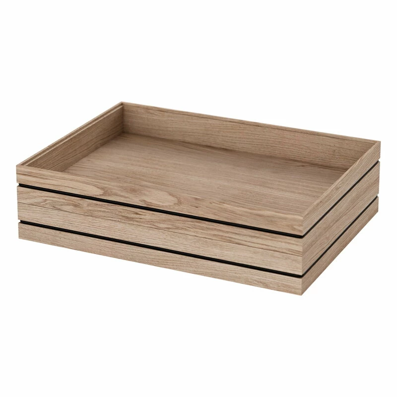 Moebe’s Organise box provides a minimalist, elegant setting for storing office supplies, accessories or magazines. The box is stackable: you can stack several boxes on top of each other to create a space-saving storage system for your desk or dressing table. The wooden storage box is decorated and simultaneously held together by a black rubber band.