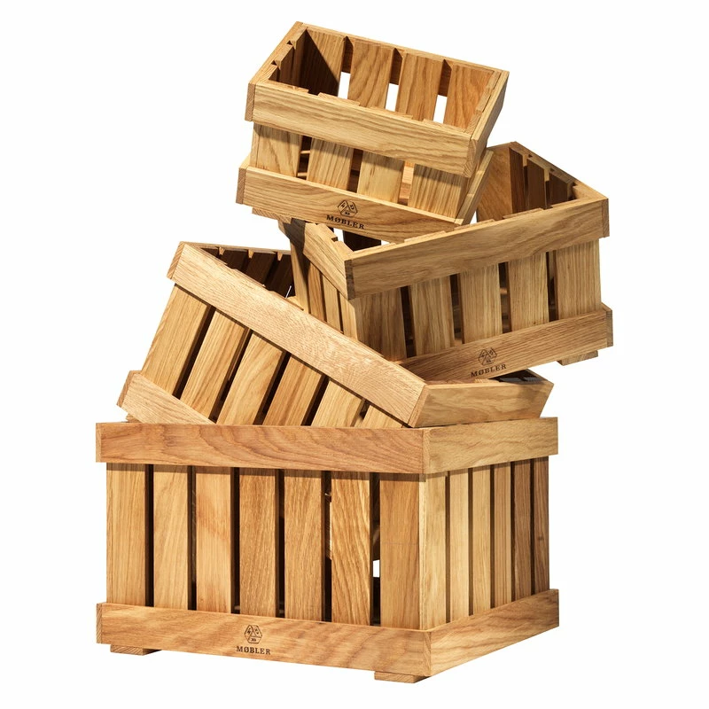 The oak wood boxes exude an old-fashioned charm that makes them the perfect addition to rustic décor, for example at a summer cottage. However, the old-timey look also creates a delightful contrast in a more urban interior. The set includes four boxes in different sizes, each finished with the FDB Møbler logo.