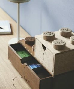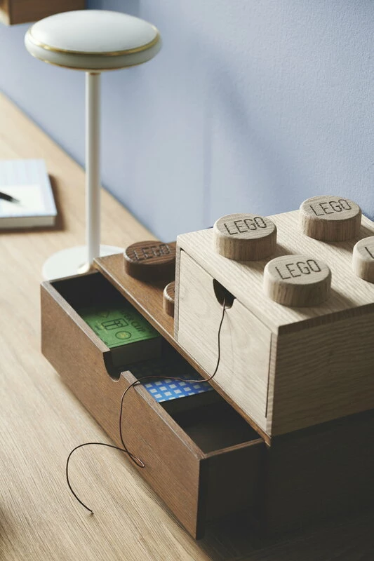 Room Copenhagen’s Lego Wooden Desk Drawers cheer up the children’s room with their playful design. The stackable storage box features a drawer that offers plenty of space for toys and other treasures in the kids’ room, or office supplies and small household items elsewhere in the home. The boxes are assembled by hand and made from dark-stained red oak โ due to the natural variation in the material, each desk drawer is unique.